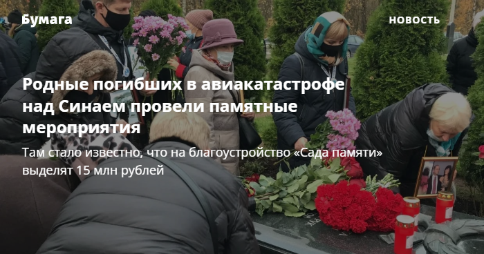 В шестую годовщину трагедии над Синаем родные жертв открыли на Серафимовском кладбище завершенный мемориал «Сложенные крылья». Впервые памятник появился там в 2017 году, он установлен на месте погребения неидентифицированных останков погибших.