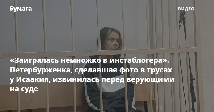 Девушка также извинилась перед верующими. «Я извиняюсь, что сделала такие фотографии, оскорбив тем самым чувства верующих людей. <…> Заигралась немножко в инстаблогера. Делала фотографии без ума. Над всем уже подумала. Всё будет удалено и больше такого не будет», — сказала она, пресс-служба записала это на видео.