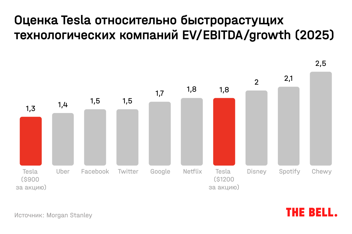 Целевая цена акций Tesla — высокая по сравнению с акциями других автопроизводителей (3x продаж в 2030-м, 14x EBITDA и 29x P/E). Однако в сравнении с другими быстрорастущими софтверными компаниями оценка выглядит более справедливой (см. график ниже). При этом прогноз инвестбанка — не самый оптимистичный на Уолл-стрит. После выхода квартального отчета аналитик Piper Sandler Алекс Поттер, к примеру, повысил целевую цену по акциям Tesla с $1200 до $1300. Он считает, что к 2030 году продажи компании достигнут 11,5 млн.