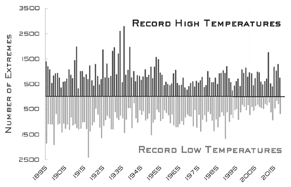 То же самое происходит, например, в США. Вот вам график рекордно высоких и рекордно низких температур в США с 1895 по 2018-й, взятый из книги Стивена Кунина Unsettled.