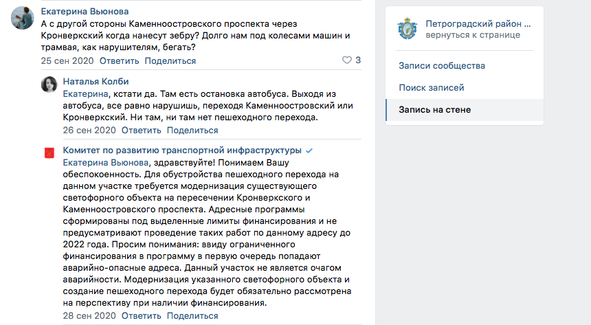 «Перейти на зеленый Кронверкский можно только сквозь строй транспорта, — отмечал Гордеев. — Еще можно подождать, когда проедет трамвай, отстоявший свое на светофоре». Петербуржца поддержали несколько участников группы. Как Гордеев рассказал «Бумаге», в процессе обсуждения он и другие жители района разработали план действий.