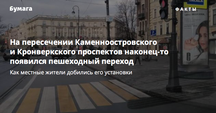 В конце октября на пересечении Каменноостровского и Кронверкского проспектов появился регулируемый пешеходный переход. Об этом в группе «Петроградская диаспора» сообщил ее участник Александр Гордеев, который вместе с другими горожанами требовал у властей появления разметки.