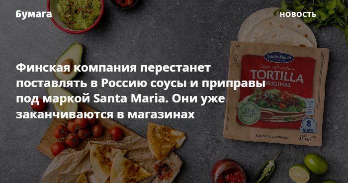 Финская компания перестанет поставлять в Россию соусы и приправы под маркой Santa Maria. Они уже заканчиваются в магазинах