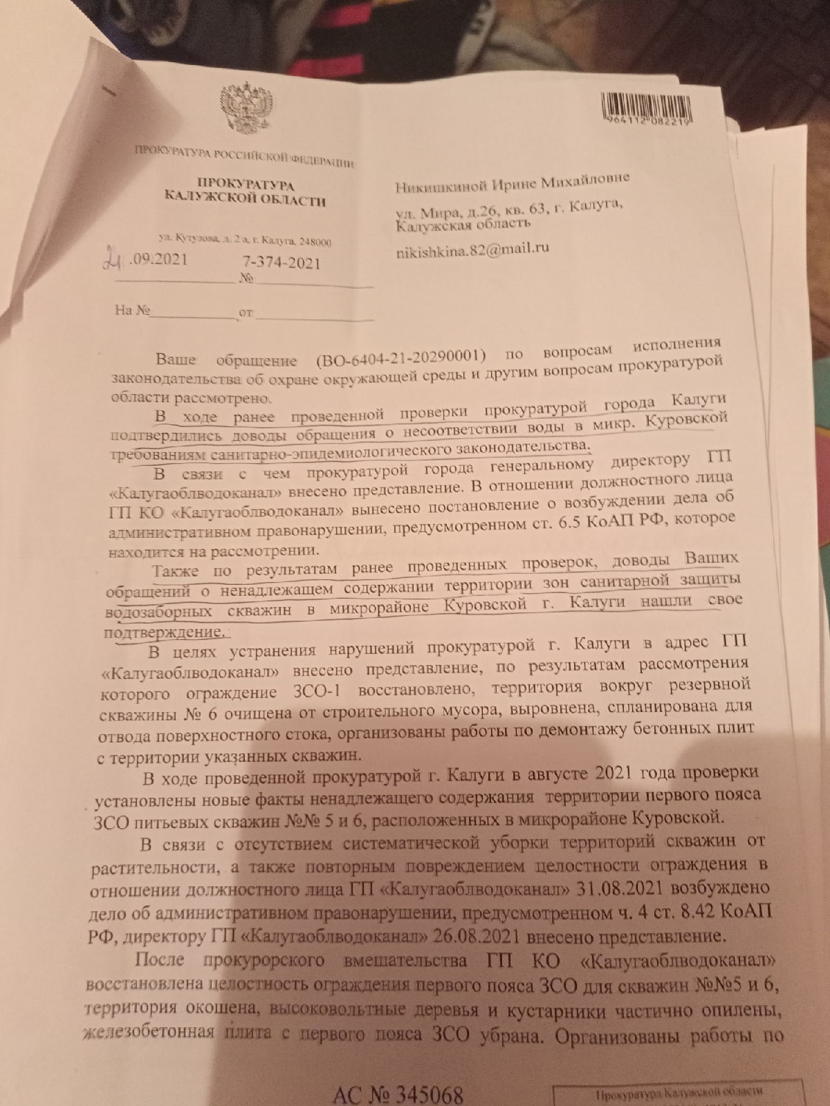 И это не только наши доводы, это подтверждено прокуратурой города Калуги, которая внесла в адрес городского головы представление 26 августа 2021 года. А значит, так называемый инертный материал является нарушением норм СанПиН, и, наверное, разработчики этих норм знают, что и как может повлиять на состояние качества питьевой воды.