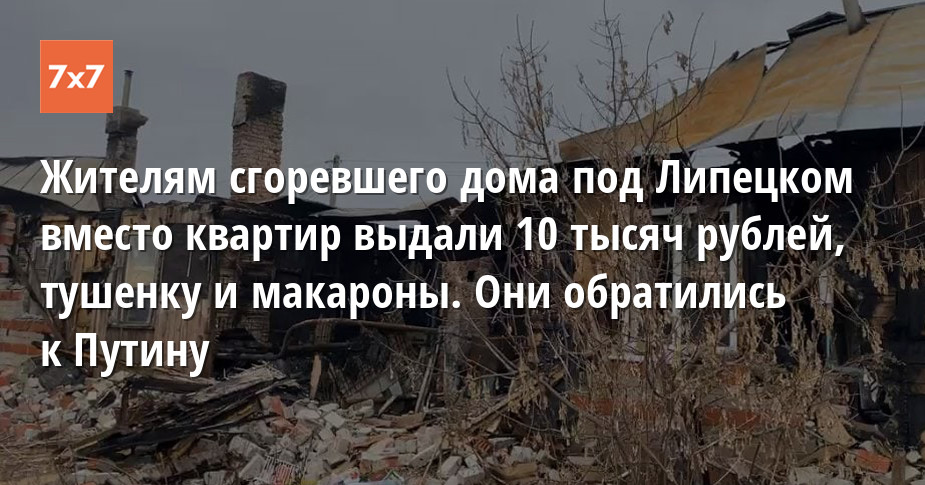Жителям сгоревшего дома под Липецком вместо квартир выдали 10 тысяч рублей, тушенку и макароны. Они обратились к Путину
