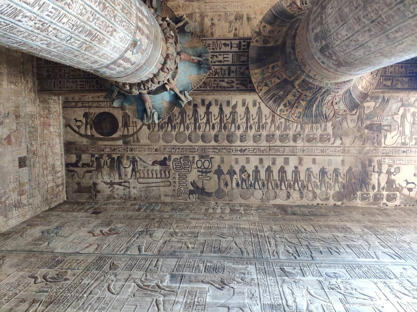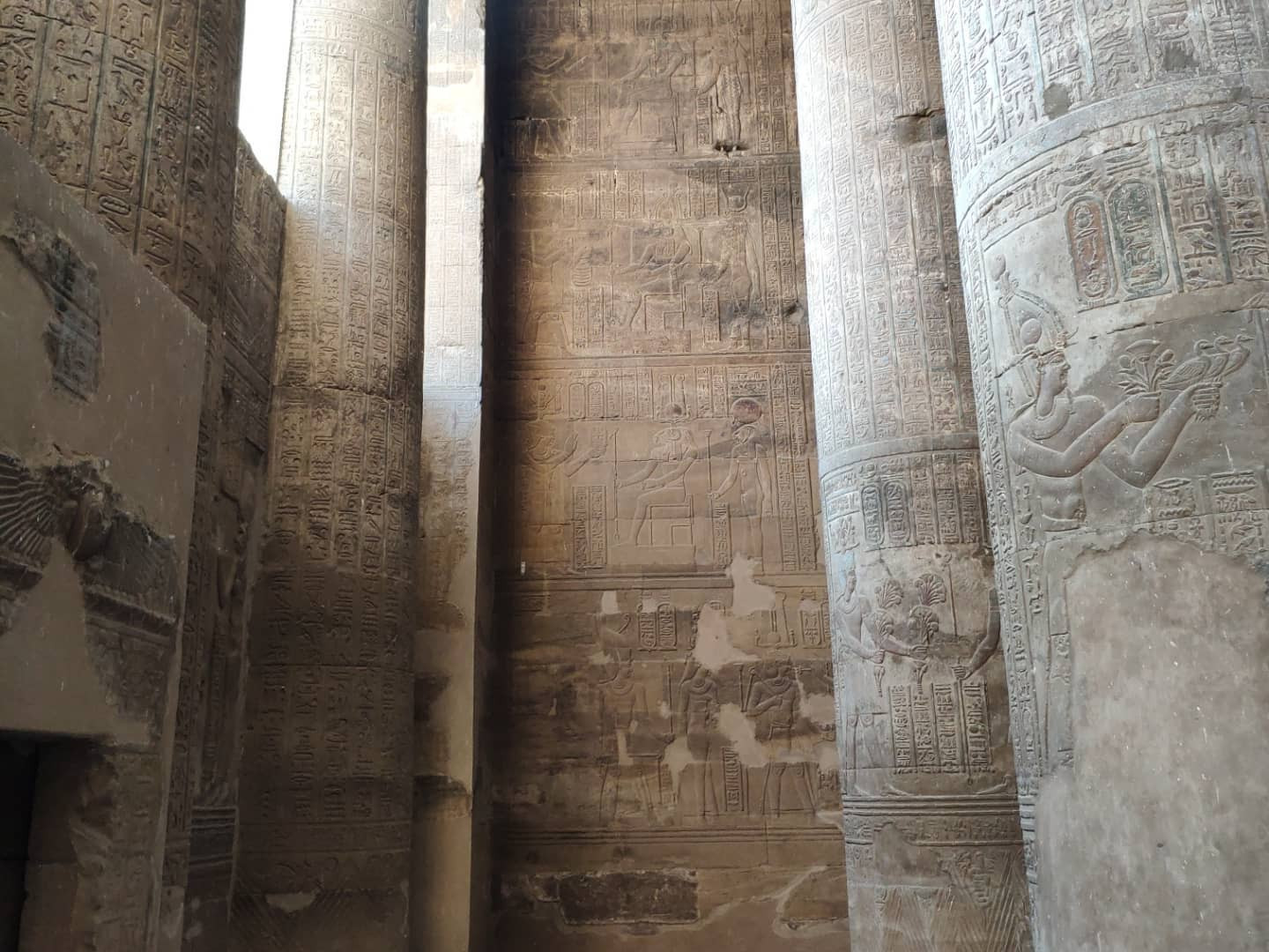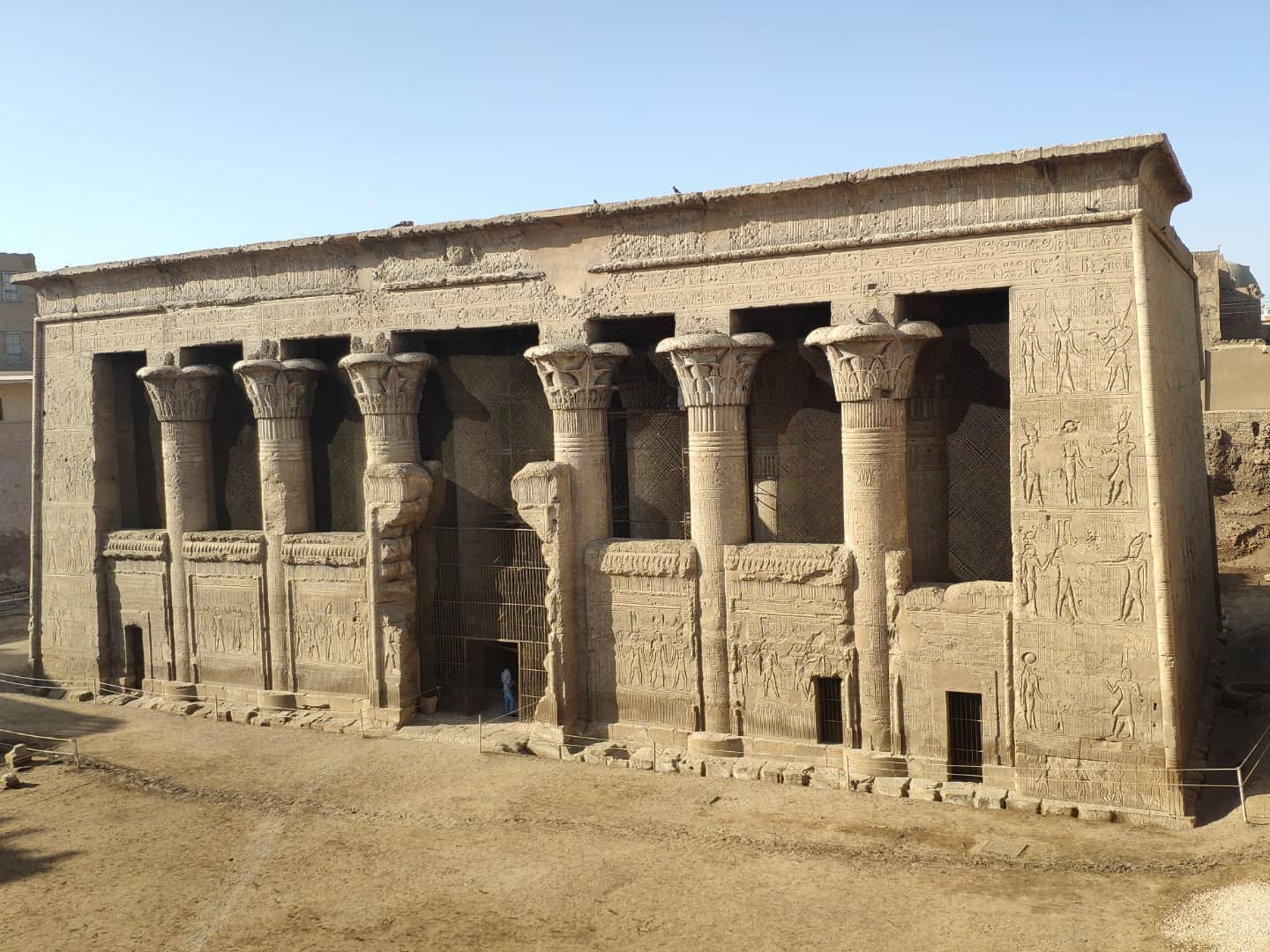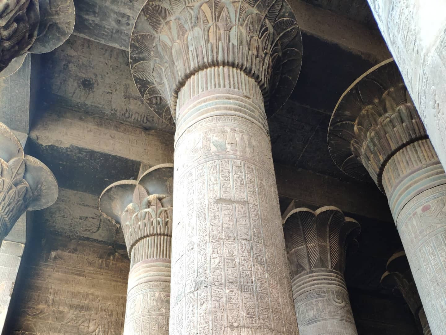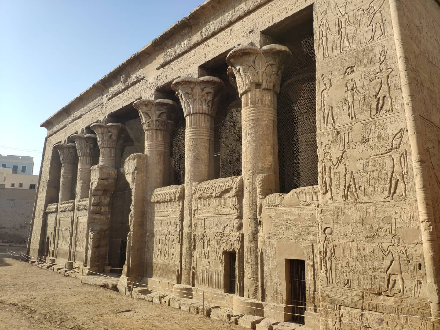 Посмотрев все основное в Луксоре, поехали на юг. Там почти все эпохи Птолемеев и римлян. Примерно 50 км южнее Луксора — Эсна. Тут ныне в котловане посреди грязной деревни храм Хнума. Храм посвящен Хнуму - богу с бараньей головой, который отвечал за разливы Нила и, соответственно, плодородие. Храм небольшой, но хорошо сохранился, и тут множество прекрасных надписей - барельефов. Строительство храма было начато при Птолемее III во второй половине II века до н. э., а было завершено только два века спустя, уже в нашу эру. Хотя при строительстве храма и была использована небольшая часть фасада от здания периода фараона Тутмоса II (XV век до н. э.), также известно, что на месте храма был более ранний храм, но от него ничего не осталось.