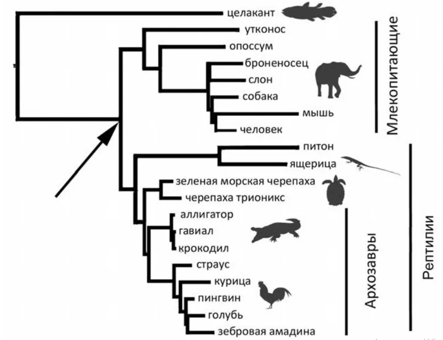 2. На рис. 2 — кладограмма из книги «Евангелие от LUCA» Максима Винарского. Пояснения автора таковы: «Одной из первых „жертв“ [кладистики] пали ни в чем не повинные птицы. Если взглянуть на родословное дерево пресмыкающихся, то мы увидим, что птицы не образуют самостоятельного эволюционного ствола: эта группа животных помещается в самой середине генеалогического древа пресмыкающихся, причем ближе к крокодилам, чем к ящерицам или черепахам…»