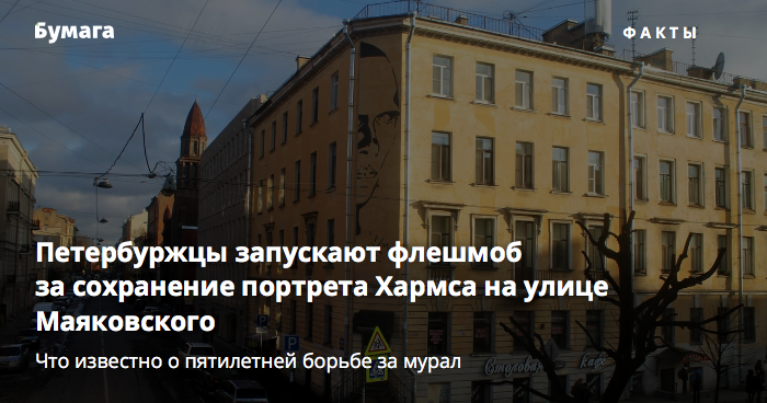 Активисты движения «Центральный район за комфортную среду обитания» вместе с жителями дома № 11 на улице Маяковского, на фасаде которого расположен мурал с Даниилом Хармсом, объявили о флешмобе за его сохранение.