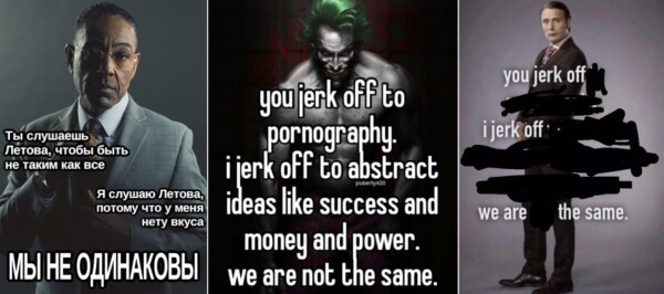 «Мы не одинаковые»: Гус Фринг, Ганнибал и Джокер превозносят себя перед собеседниками в меме о нелепых сравнениях
