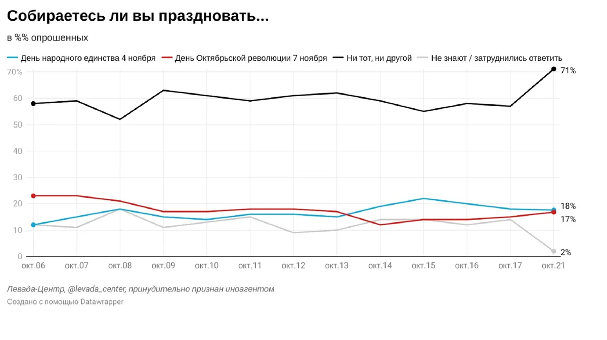 Абсолютное большинство россиян — 71% — не собираются отмечать ни День народного единства, ни день Октябрьской революции, следует из опроса «Левада-центра»* (имеется в распоряжении «Новой газеты»).