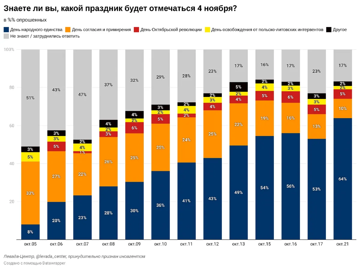 При этом две трети россиян (64%) знают, какой праздник отмечается 4 ноября. Этот показатель, как отмечает «Левада-центр», заметно вырос с 2017 года (53%). В целом уровень осведомленности россиян о празднике растет с 2005 года (8%), небольшое падение было лишь в 2017 году (по сравнению с 2016 годом этот показатель сократился с 56 до 53%).