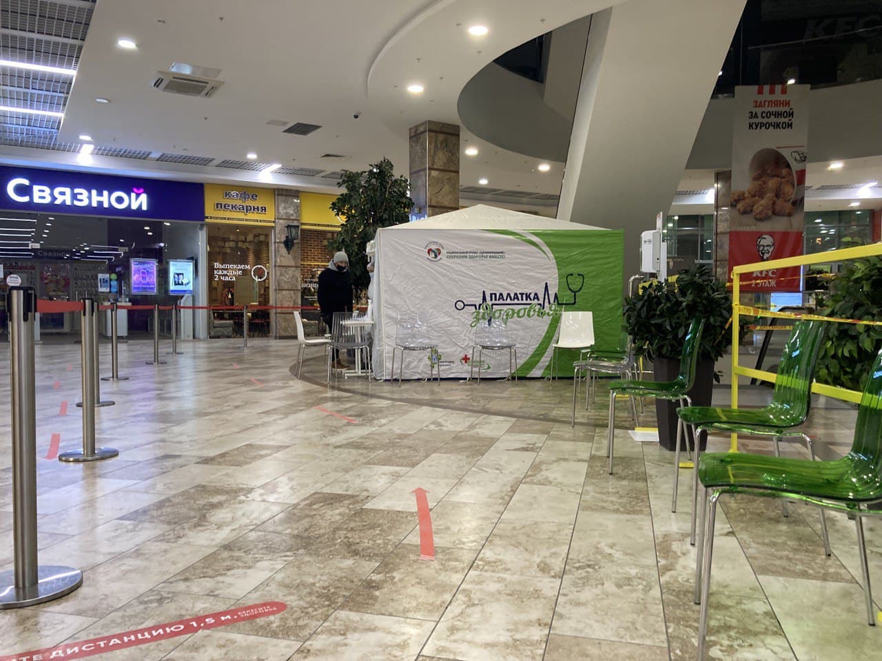 В крупных торговых центрах с момента введения "локдауна" установили палатки для вакцинации, ажиотажа возле них не наблюдается.