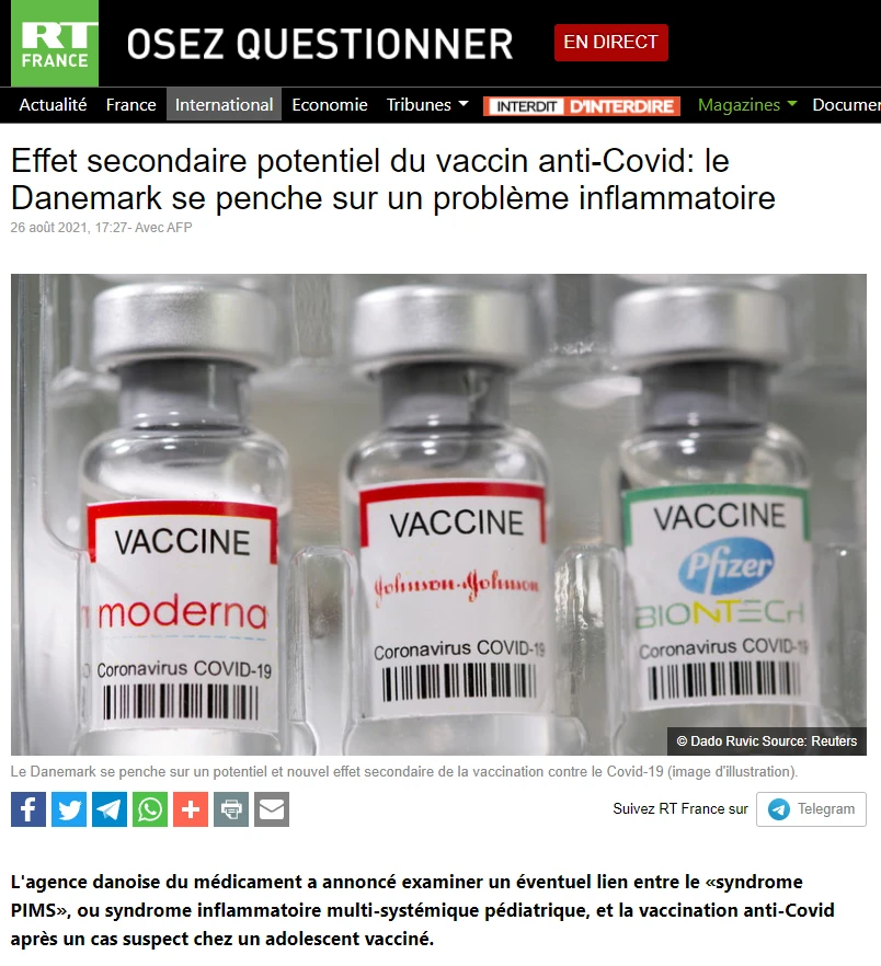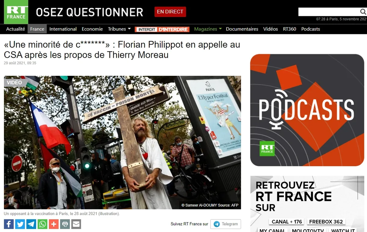 08.10. «COVID: уровень вакцинации не влияет на циркуляцию вируса, согласно одному исследованию» (исследование разместил в соцсетях инфекционист-«вакциноскептик» Дидье Раульт. RT внутри новости формально приводит и позицию ВОЗ, согласно которой вакцинация — важнейший способ снижения уровня заболеваемости. Серьезная французская пресса критикует это исследование).