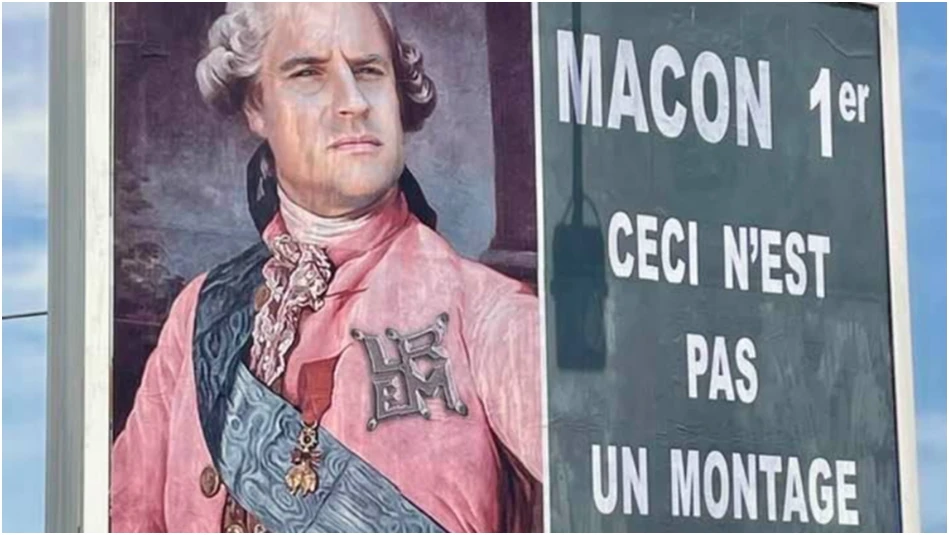 04.08. «Macon Первый»: после гримировки под Гитлера варский рекламщик «переодел» Макрона в монарха». (Вар — департамент во Франции. Macon — не опечатка, con — грубое французское ругательное слово.)