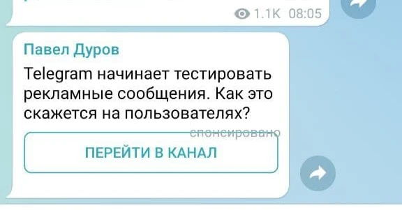 Теперь Дуров может вставлять в крупные телеграм-каналы сообщение со ссылкой на собственный канал с текстом «Telegram начинает тестировать рекламные сообщения. Как это скажется на пользователях?». Этот пост закрепляется последним в канале, удалить сообщение Дурова из своего канала невозможно.