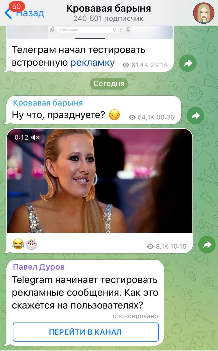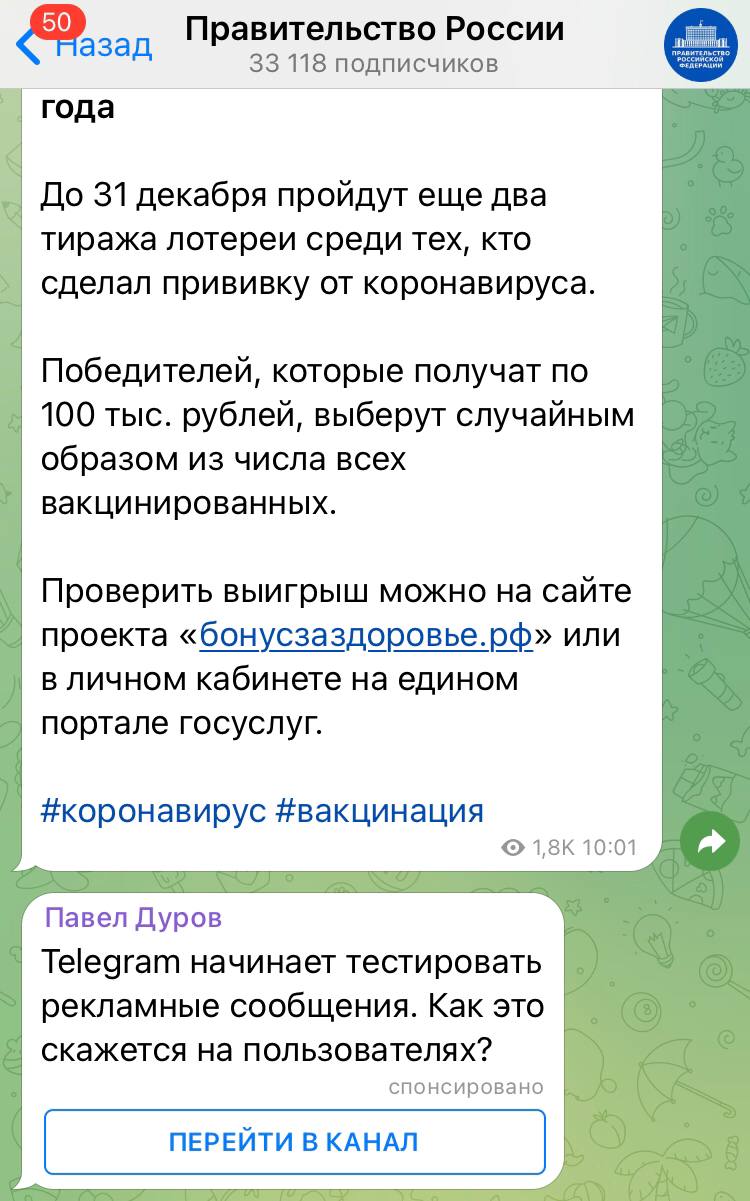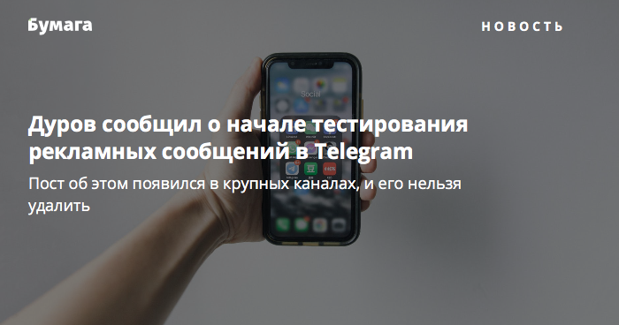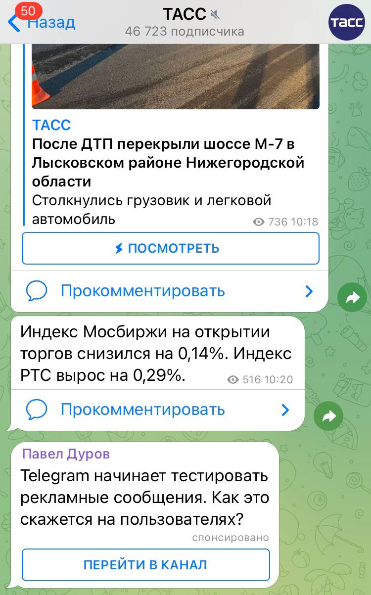 Telegram запустил тестирование рекламы. Пост об этом появился в крупных каналах со ссылкой на основателя мессенджера Павла Дурова.