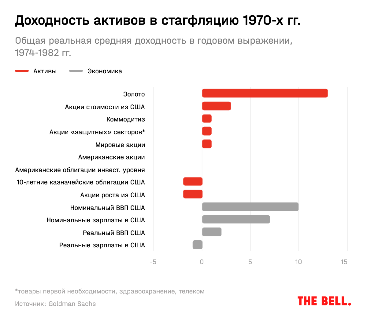 В случае со стагфляцией все еще сложнее. Мы нашли и изучили октябрьский отчет Goldman Sachs, в котором анализируется как раз этот вопрос. Аналитики банка подсчитали, что в период стагфляции в 1974–1982 годах среднегодовая реальная доходность американского рынка акций составила всего 0,1%, а лучшим активом, причем с большим отрывом, было золото. Но в Британии в тот же период акции приносили в среднем по 8% в год. И это не единственное отличие: в США акции стоимости во времена стагфляции обошли акции роста, а в Англии — нет; в США фонды, инвестирующие в недвижимость (REIT), были лучшим активом, в Великобритании — одним из худших. Так что универсального совета, на какие активы стоит ставить инвесторам в случае стагфляции, попросту нет, приходят к неутешительному выводу аналитики Goldman Sachs.