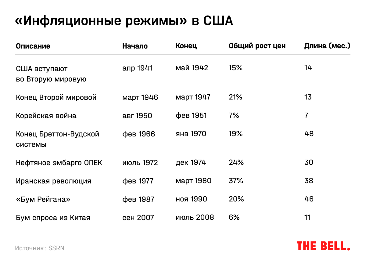В MAN Institute выделяют восемь «инфляционных периодов» в США за последние 95 лет, когда инфляция превышала 5% в годовом выражении на протяжении не менее 6 месяцев подряд. В «инфляционном режиме» экономика США провела 19% времени.