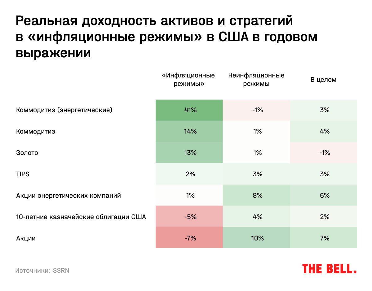 На первый взгляд, защитные активы вычислить довольно легко. В прошлом положительную реальную доходность в период умеренной инфляции приносили акции энергетических компаний. Биржевые коммодитиз, также считающиеся одним из самых очевидных хеджей, тоже, как правило, давали высокую доходность, а все остальное время — почти не приносили прибыль инвесторам.