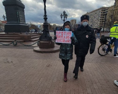 Активисты потребовали освободить политзаключенных и выступили против онлайн-голосования. Как минимум одну из них полицейские задержали с применением силы.