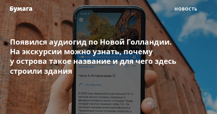 Аудиогид состоит из 14 коротких рассказов на русском и английском языке. С его помощью можно узнать, почему остров начали называть Новой Голландией, для чего строили здание «Дом 12» и какая функция была у постройки, которую сейчас зовут «Бутылкой».