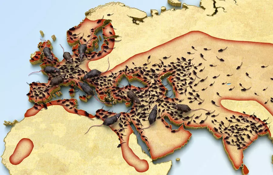 Вариантов распространения несколько. Например, нехватка пищи из-за резкого всплеска популяции может погнать грызунов к человеческим жилищам. Там грызуны неизбежно контактируют с домашними крысами, передав им своих блох (соседство с крысами для средневекового человека, можно сказать, дело привычное, не говоря уже о том, что многие крестьяне фактически жили со скотом под одной крышей). Другой путь распространения — сумки и повозки путешественников-торговцев.