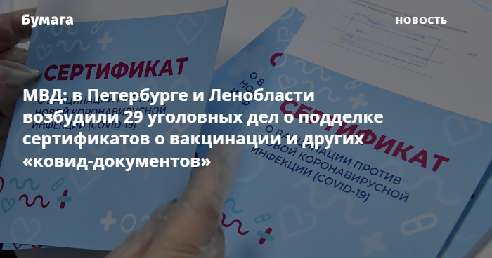 С начала 2021 года в Петербурге и Ленобласти возбудили 29 уголовных дел о подделке «ковид-документов. Об этом 8 ноября пишет 78.ru со ссылкой на официальный ответ пресс-службы регионального ГУ МВД.