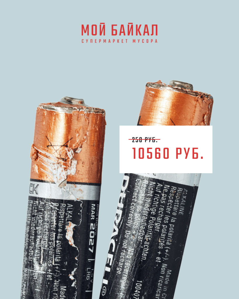 Использованные батарейки в магазине «Мой Байкал»Фото: скриншот с сайта магазина В магазине можно приобрести батарейки за 10 560 рублей, пластиковую бутылку за 306 рублей, использованный детский подгузник за 545 рублей и многое другое. Цены установили на основе расчетов профессионального эколога. Он установил сумму ущерба экологии от каждого товара: его производства, сроков и особенностей разложения, стоимости логистики и переработки и других факторов.