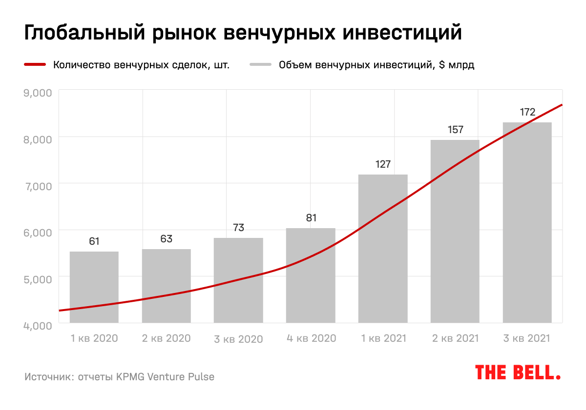 Финансовые рынки в 2020–2021 годах переживают глобальный бум, не исключение и венчурный рынок. За 9 месяцев 2021 года венчурные инвесторы вложили почти $456 млрд в стартапы на разных стадиях более чем в 22,8 тысячи сделок. Согласно подсчетам KPMG, это уже на 64% больше по объему и на 20% больше по количеству сделок, чем за весь 2020-й, а в сравнении с 9 месяцами предыдущего года рост становится стремительным — 131% по объему и 68% по количеству.