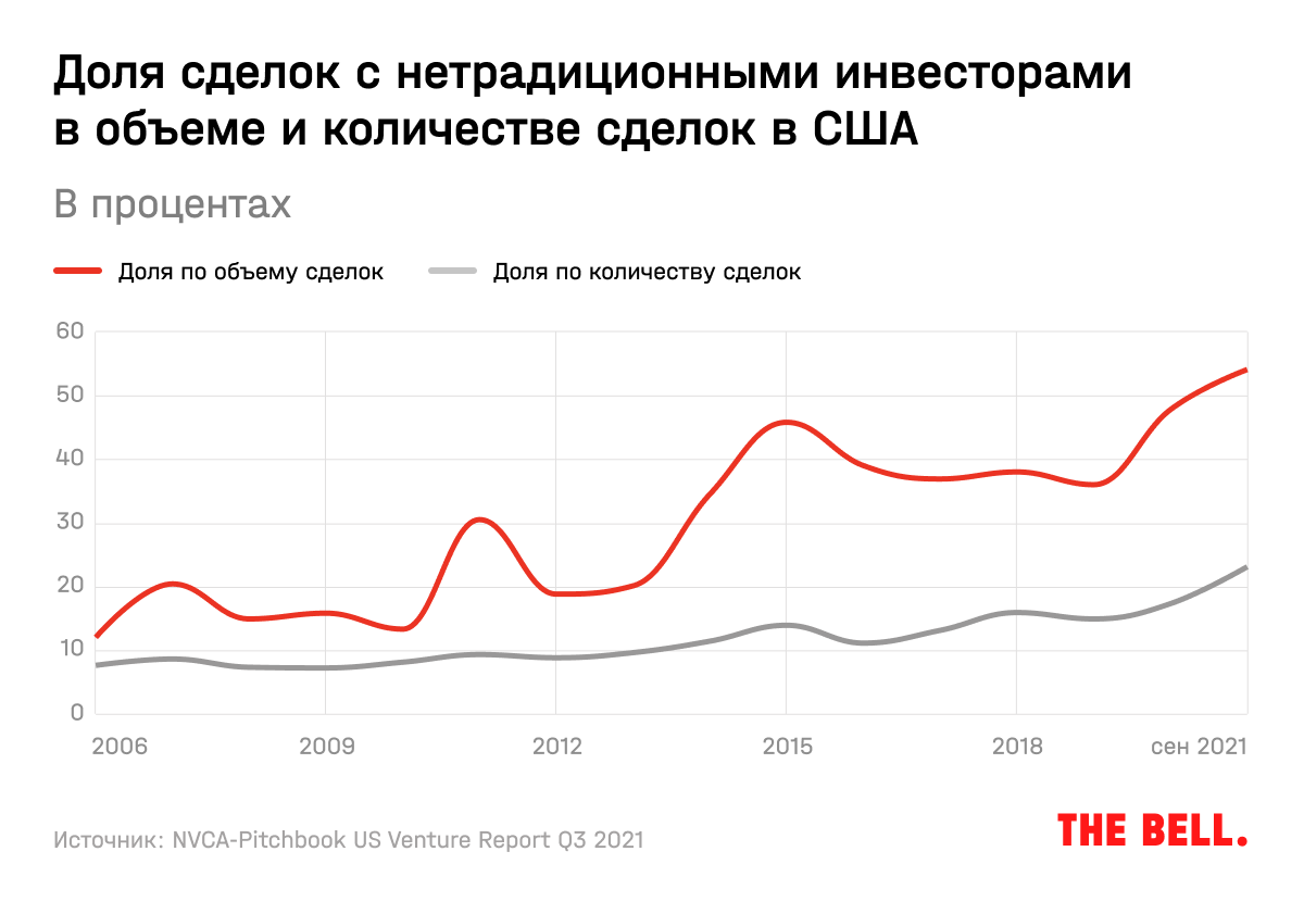 В последние годы активную роль на венчурном рынке играют и так называемые «нетрадиционные» инвесторы — хедж-фонды, семейные офисы, корпоративные инвесторы. У них совершенно другая модель принятия решений, другой подход, аппетит к риску. Они — важный фактор разгона всего рынка.