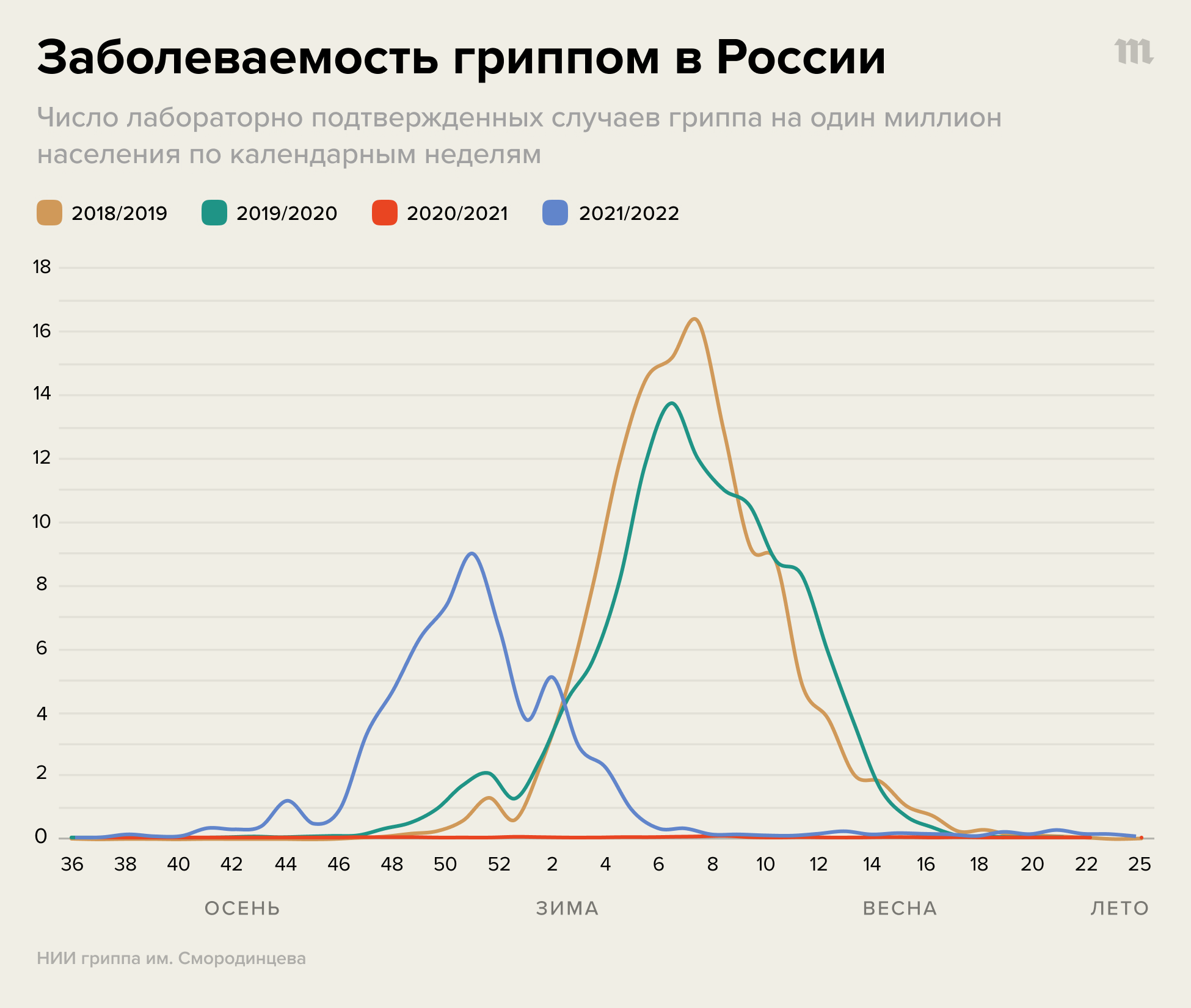Обычно эпидемии гриппа в России начинаются в первые недели календарного года — в январе или начале февраля (об этом говорит исследование, которое описывает результаты наблюдения за гриппом на основании эпидемиологических и лабораторных данных). Впрочем, в относительно тяжелом сезоне 2009–2010 (когда в России зарегистрировали 622 смерти из-за гриппа, который был подтвержден лабораторно) эпидемия началась уже в начале октября.