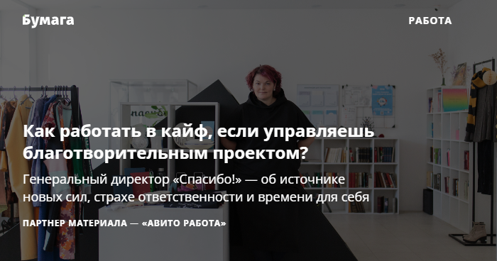 Как работать в кайф, если управляешь благотворительным проектом? Генеральный директор «Спасибо!» — об источнике новых сил, страхе ответственности и времени для себя