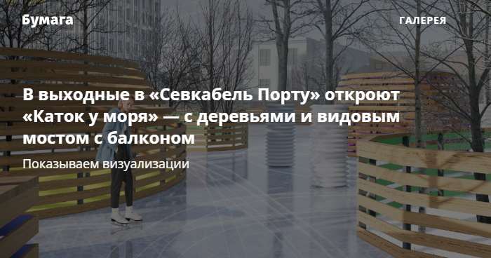 В «Севкабель Порту» 13 ноября откроют панорамный «Каток у моря». Его центральная часть будет украшена деревьями, а общая площадь катка составит 2,2 тысячи квадратных метров. «Бумага» показывает, каким станет каток, — и рассказывает, как он будет работать.