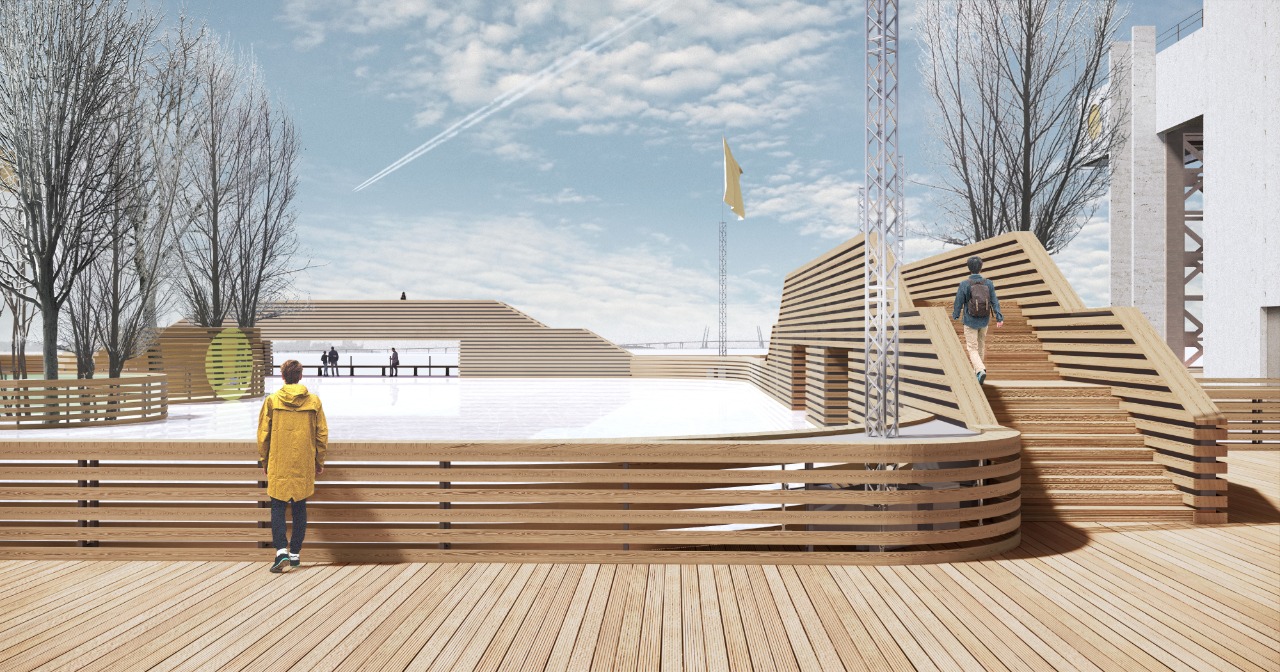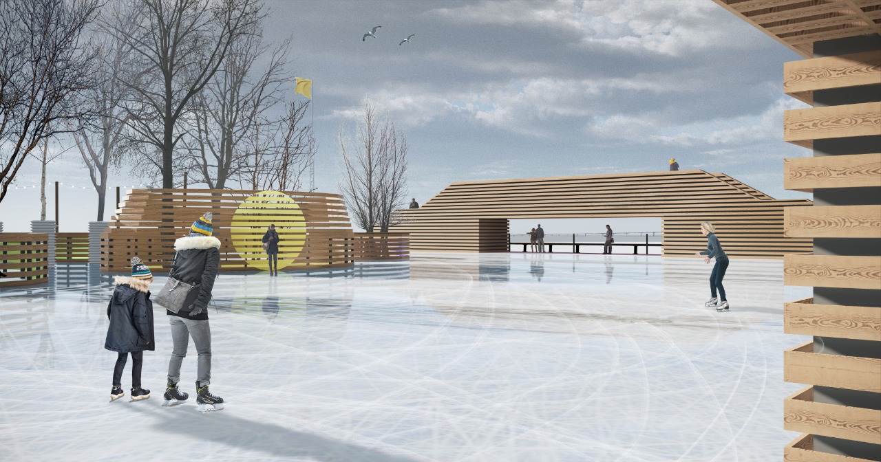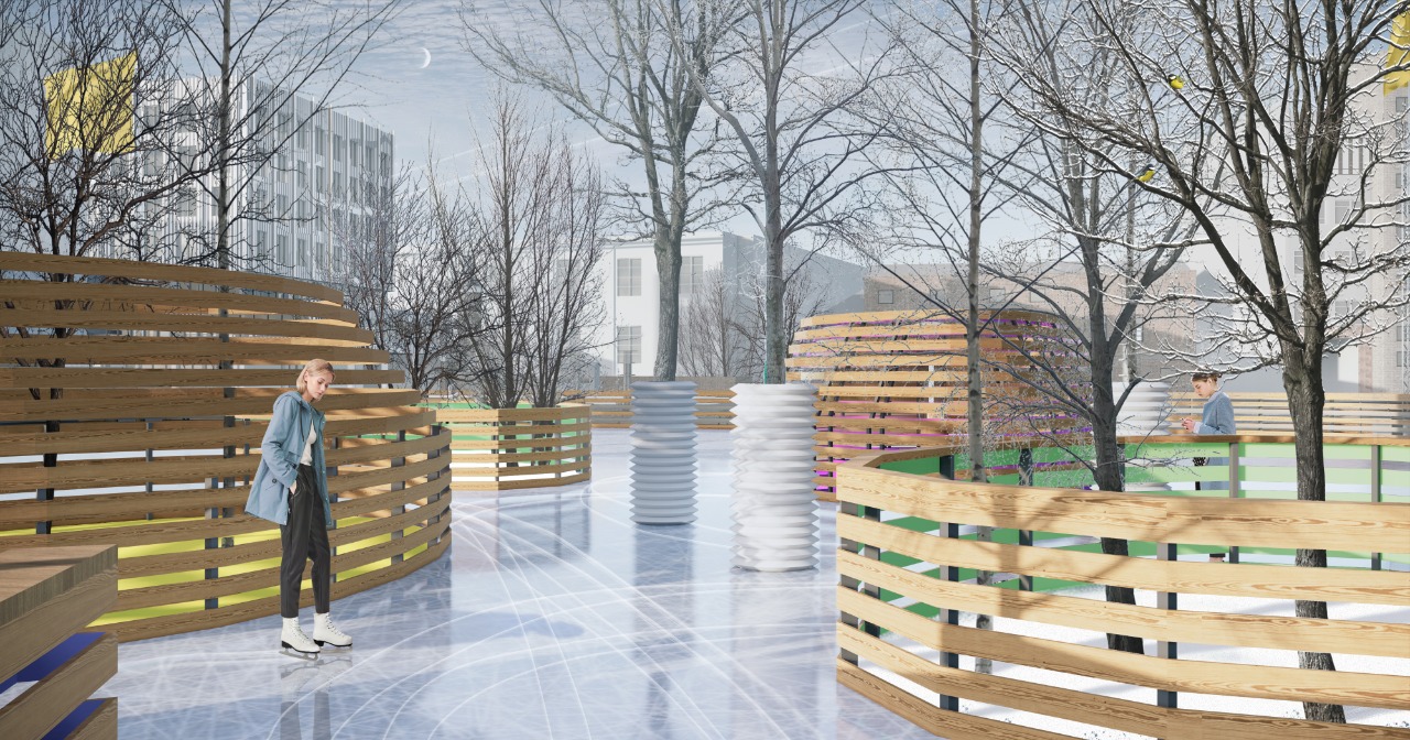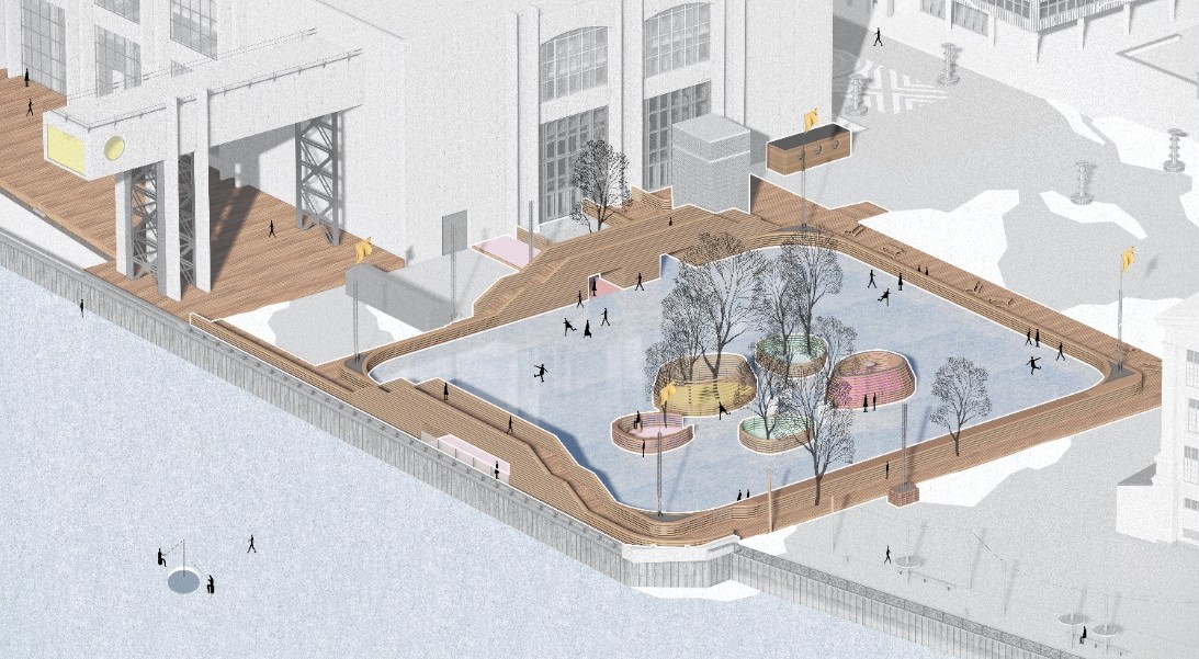 В выходные в «Севкабель Порту» откроют «Каток у моря» — с деревьями и видовым мостом с балконом. Показываем визуализации ❄️