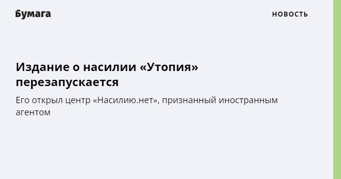 Медиа «Утопия», которое запустил центр «Насилию.нет» (признан иноагентом), закрывается. Точная причина не уточняется. Отмечается, что решение приняли после «долгих обсуждений» с гендиректором проекта Анной Ривиной.