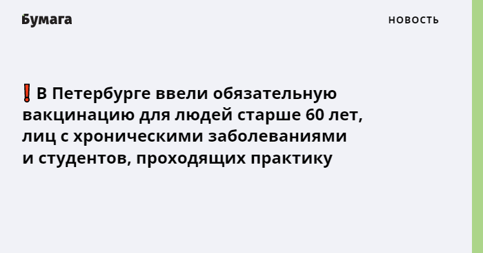 ❗️ В Петербурге ввели обязательную вакцинацию для людей старше 60 лет, горожан с хроническими заболеваниями и студентов, проходящих практику