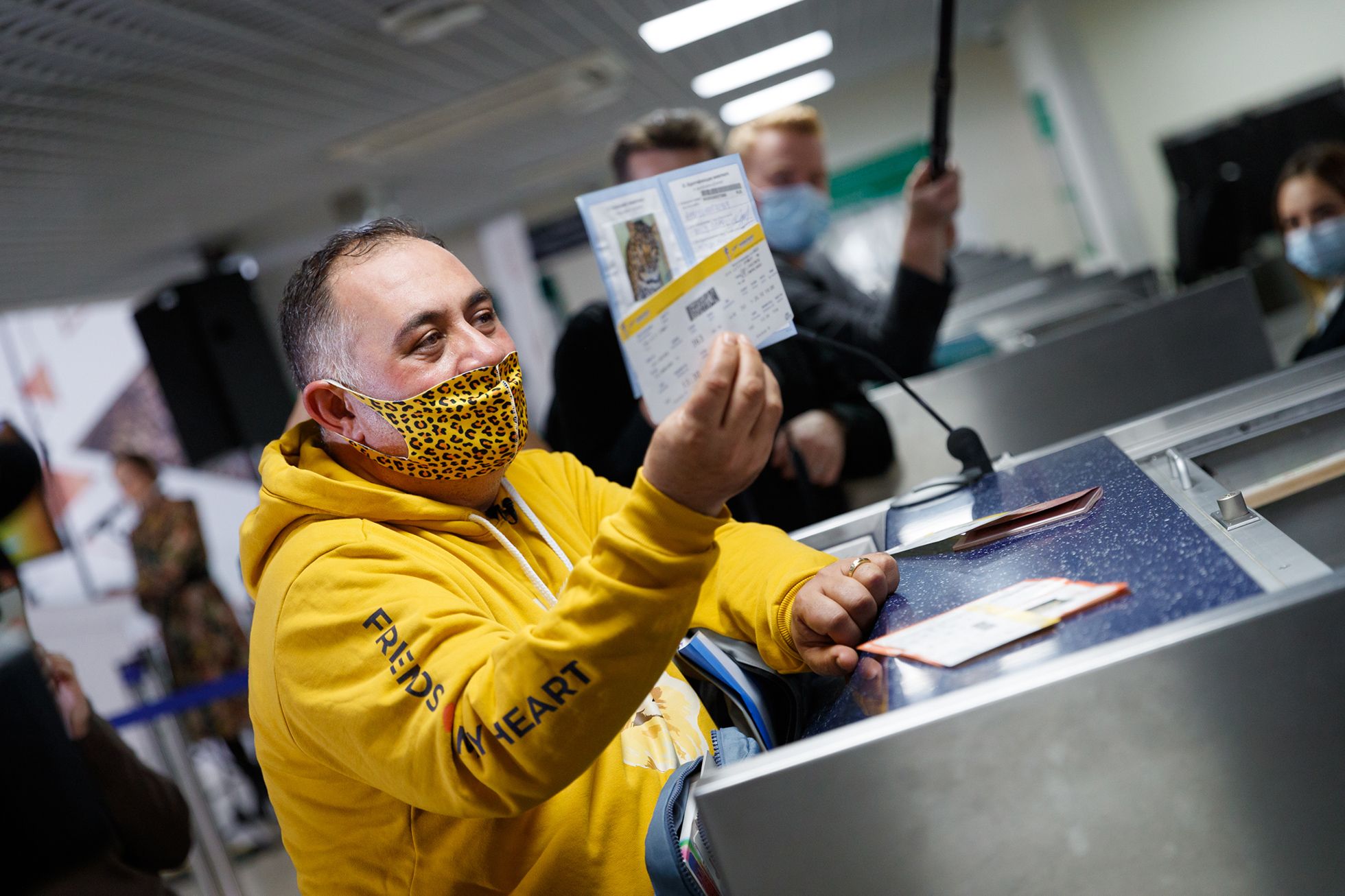 Все оживляются, когда подходит плотный невысокий мужчина в толстовке с изображением львенка. Он передает сотруднице аэропорта ветеринарные паспорта: в одном фотография льва, очень похожего на картинку на толстовке, в другом — портрет пятнистой кошки. Сотрудница аэропорта возвращает документы и выдает посадочные талоны.