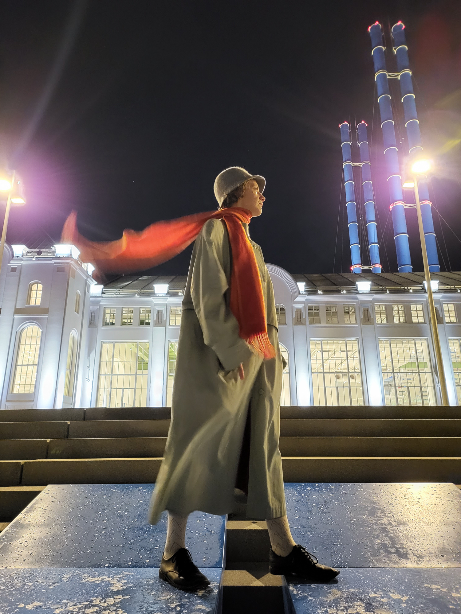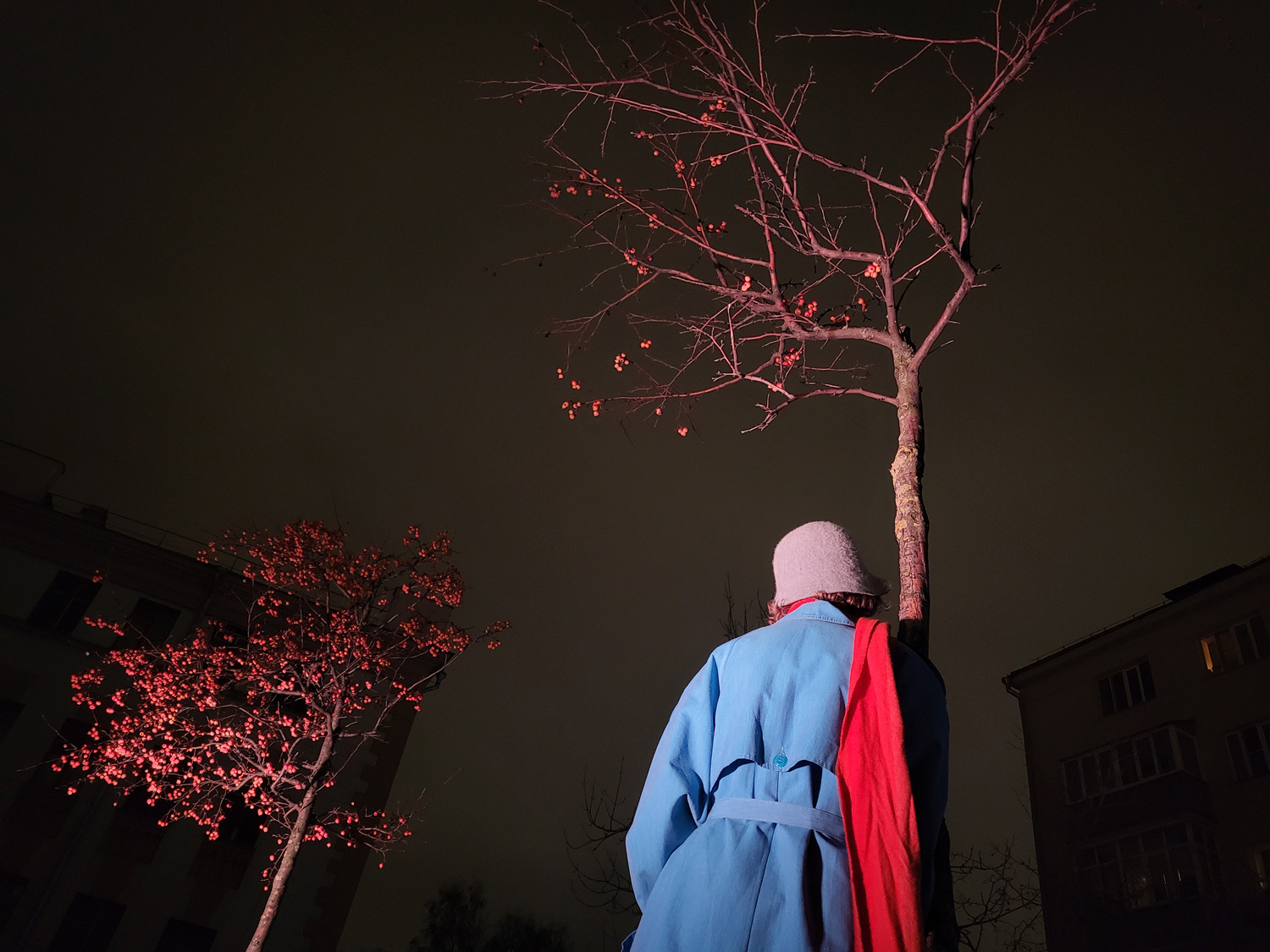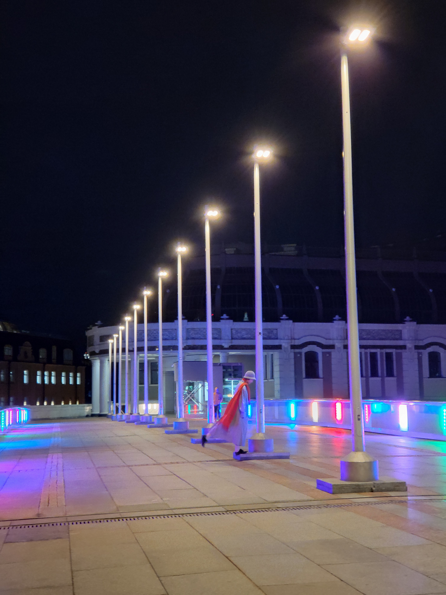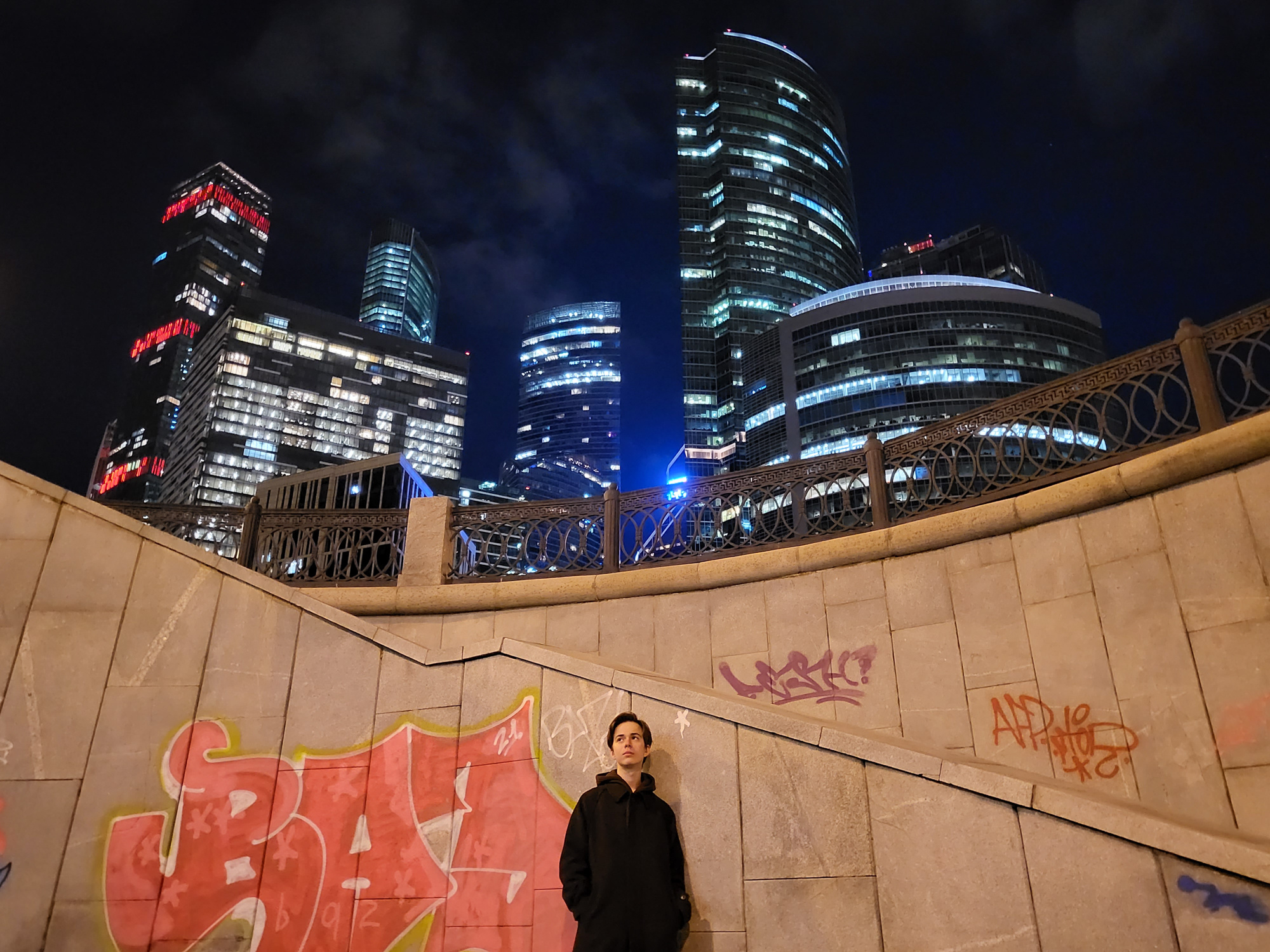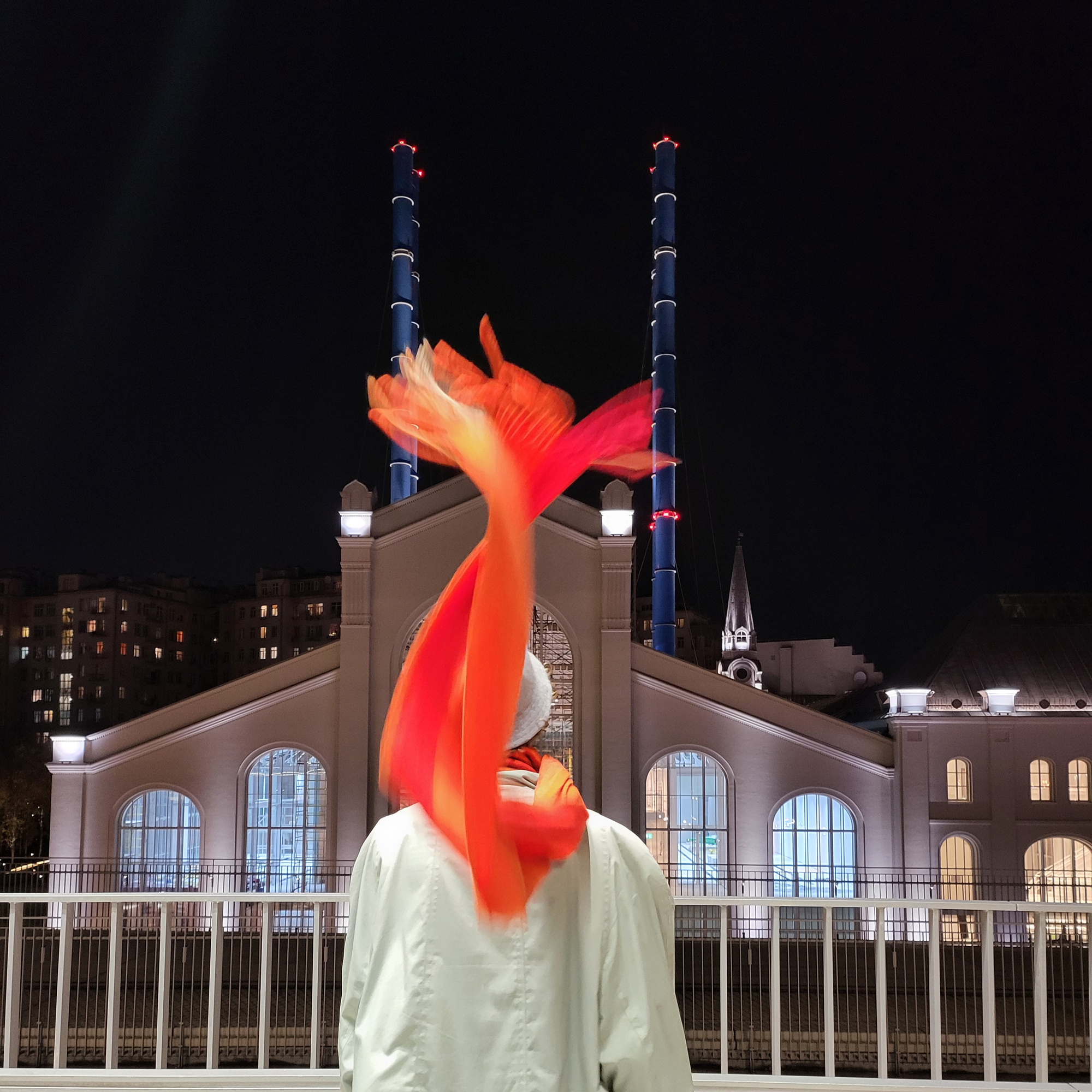 Если включить на смартфоне режим «Про», можно задать вручную значение выдержки, светочувствительности (ISO) и баланса белого. Это открывает много возможностей для экспериментов с размытием движущихся объектов. Классический пример, когда поток машин превращается в светящиеся линии. Подгадайте момент в темное время суток, когда на статичном фоне будет двигаться какой-то предмет: это может быть не только транспорт, но и человек или, например, кусок ткани. Если повезет, получится подловить интересный эффект: например, на этом фото шарф напоминает пламя. При этом за счет длинной выдержки даже при плохом освещении архитектура на фоне будет хорошо прорисована.