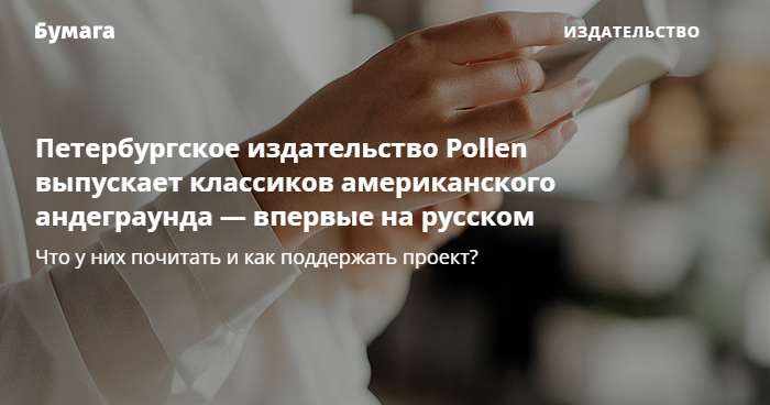 Некоммерческая издательская инициатива Pollen знакомит русскоязычных читателей с андеграундными американскими авторами XX века и контекстом их произведений. Книги и журналы под этой маркой быстро становятся библиографической редкостью, а выпускаемые командой романы — всегда первые переводы на русский язык. Проект развивается благодаря волонтерам, среди которых переводчики Сергей Карпов и Алексей Поляринов, а деньги на издание книг собирают с помощью краудфандинга.