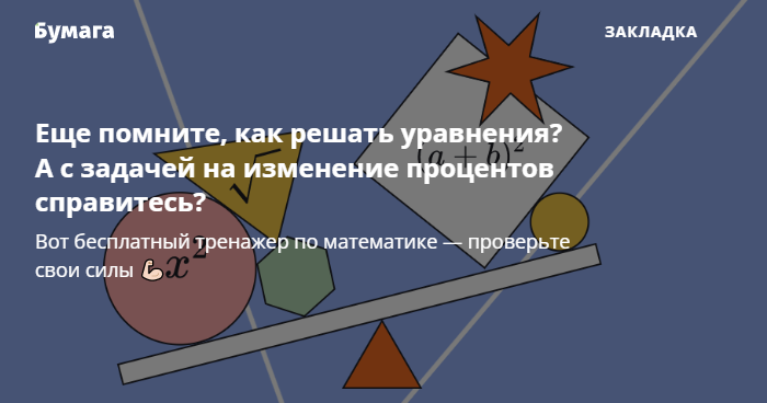 Еще помните, как решать уравнения? А с задачей на изменение процентов справитесь? Вот бесплатный тренажер по математике — проверьте свои силы 💪🏻