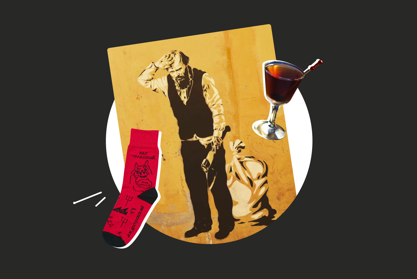 «Бумага» выбрала шесть идей, как отметить день рождения Достоевского. Читайте, где попробовать коктейль, названный в честь повести «Кроткая», какие носки входят в набор «Достоевщина» и как изображали писателя петербургские уличные художники.