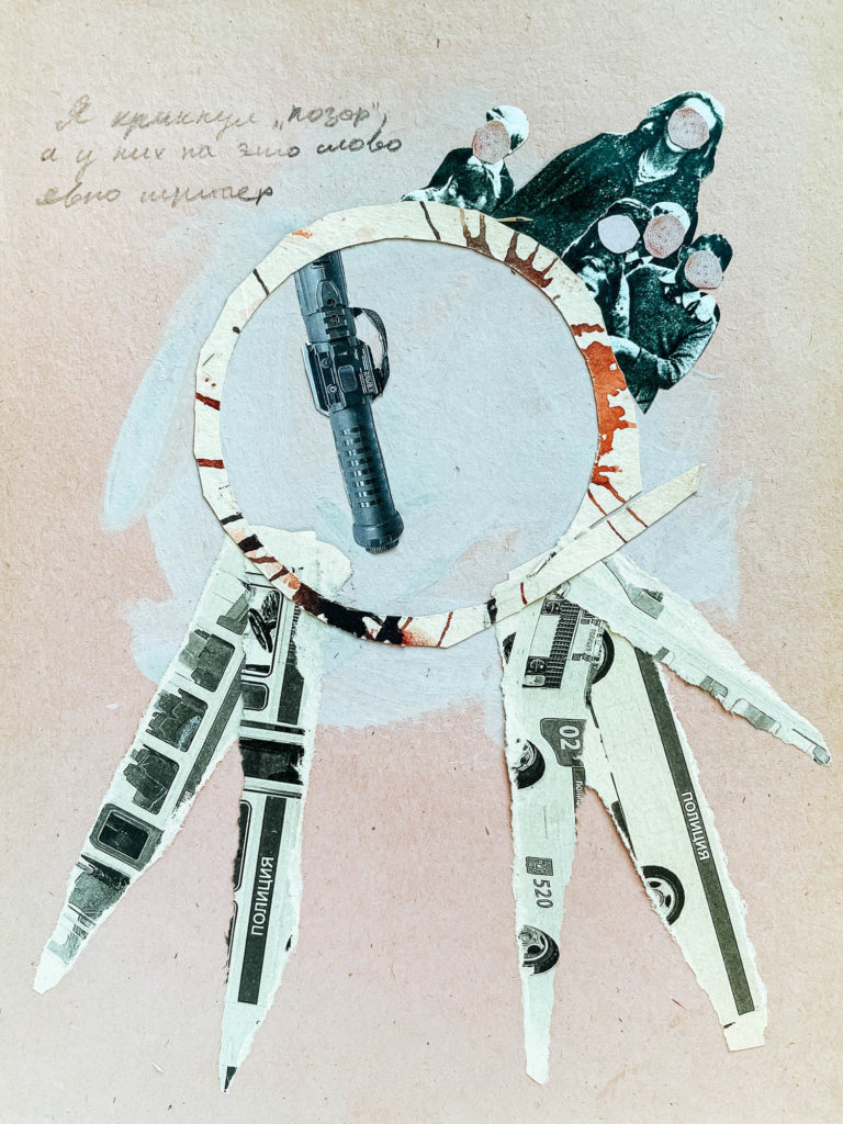 «Приехала полиция, выбежал толстый подполковник и отдал приказ всех задержать, — вспоминает Вадим. — Всех окружили и вместе с журналистами взяли в кольцо. Я не убегал, у меня дочь рядом, я бы от нее никуда не убежал. Человек в полицейской форме с заклеенным жетоном взял меня за плечо и потащил. Дочь я от него закрывал. Я видел, как женщин били и волочили по земле. Никаких скидок на то, что девушка, — все силовым способом. В какой-то момент я услышал треск рядом. Потом ощутил непонятную боль. Я сразу подумал, что это электрошокер, потому что уже видел, как их применяли. Я сказал, что не сопротивляюсь и не нужно использовать шокер. Тогда полицейский снова ударил меня по ноге».