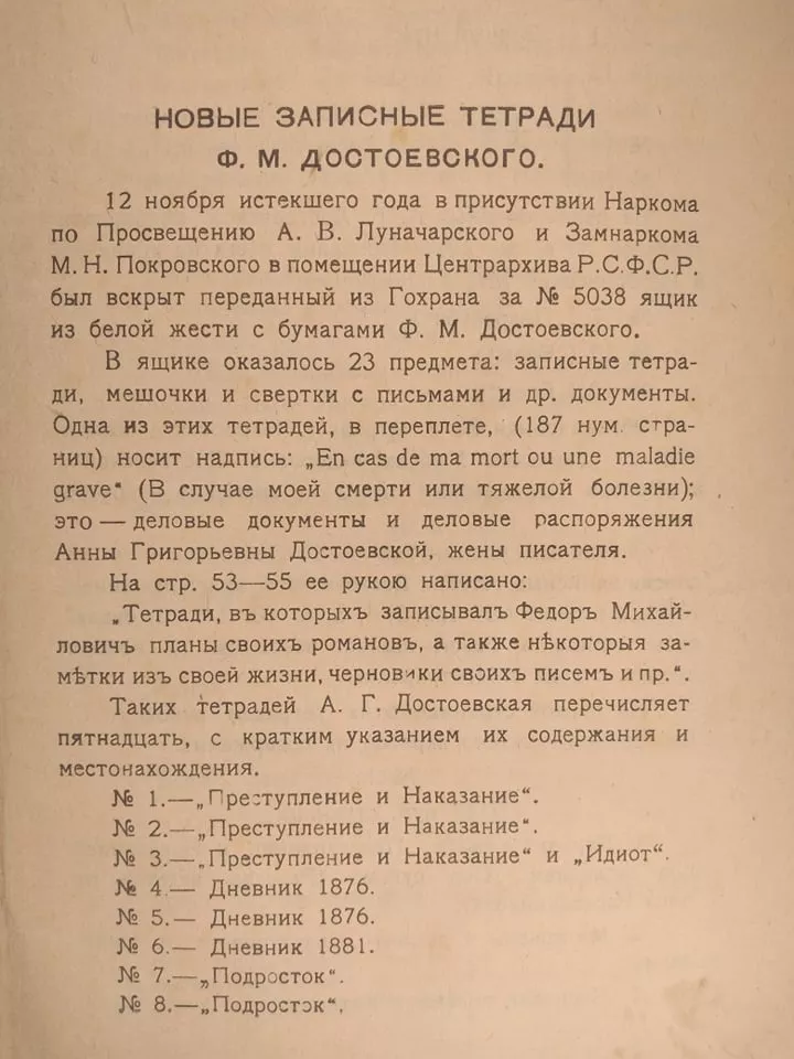 В банк и музей было передано далеко не все. Часть рукописей Анна Григорьевна оставила в семье, предполагая распределить между наследниками. В 1917 году Достоевская уезжает из Петербурга на юг, предварительно оставив еще одну часть рукописей в банковской ячейке. 24 июня 1921 года «Малый Совнарком» предписал Наркомфину изъять ячейку и передать все ее содержимое заместителю наркома просвещения РСФСР, известному историку-марксисту Михаилу Покровскому. В ноябре того же года вынутые из ячейки рукописи Достоевского были переданы Главархиву. Руководители главной архивной службы молодого государства поставили задачу разыскать и объединить в одном фонде как можно больше материалов Достоевского. Но это оказалось нетривиальной задачей.