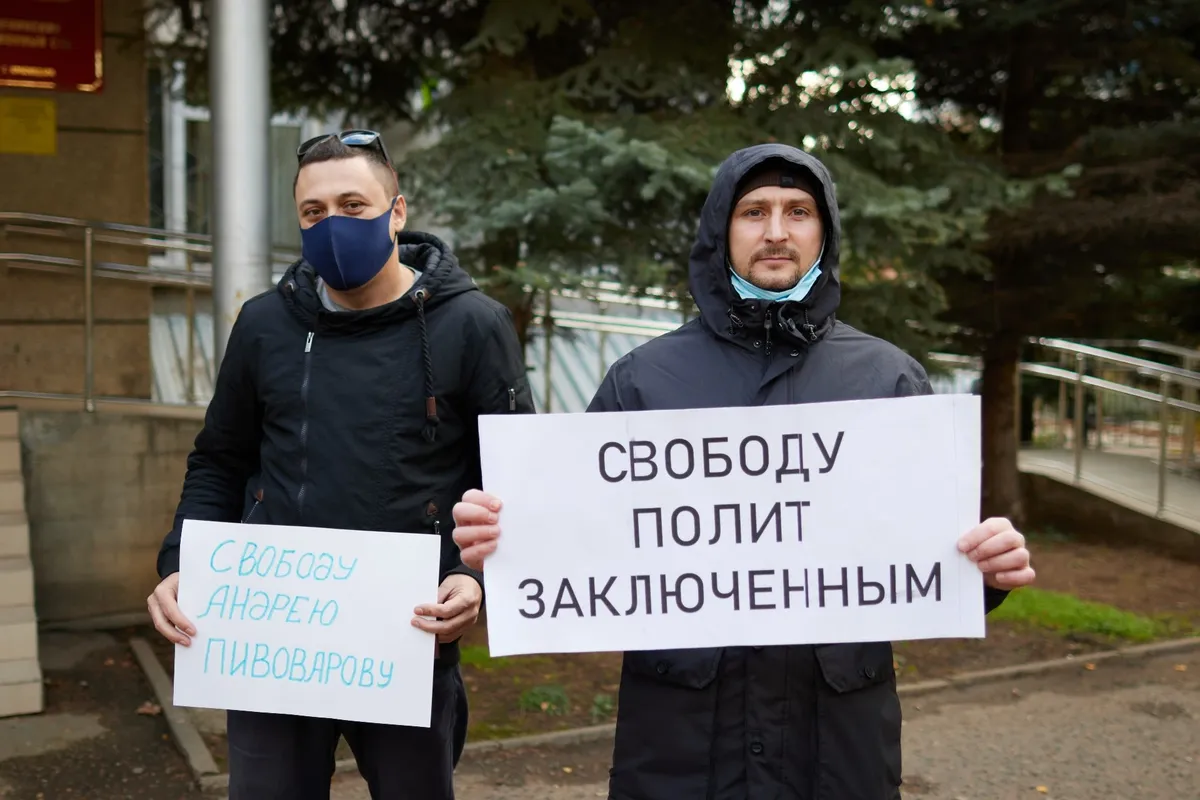 У здания Ленинского районного суда в Краснодаре за полчаса до заседания собралось около 10 человек: местные активисты, пожилая мать Пивоварова и его друзья, а также несколько журналистов. Неподалеку от главного входа в здание притаились автозак и несколько автомобилей ГИБДД. Когда двое активистов встали в пикеты с плакатами «Свободу Андрею Пивоварову» и «Остановите политические преследования», сотрудники полиции переписали их паспортные данные, но задерживать не стали. Слева, справа и напротив входа в суд с ноги на ногу переминались неприметные мужчины в темной одежде, медицинских масках и с кожаными сумками, изредка перебрасываясь парой слов с полицией.