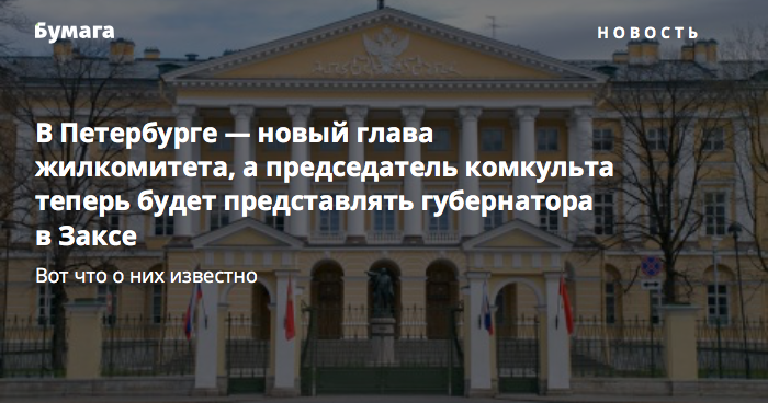 В Петербурге — новый глава жилкомитета, а председатель комкульта теперь будет представлять губернатора в Заксе