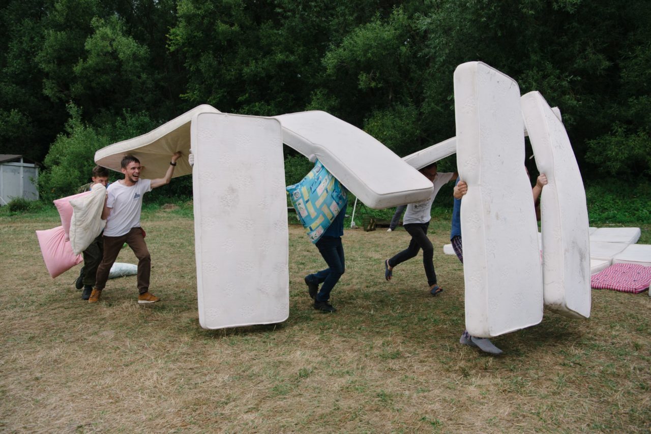 Бои с подушками и матрасами во время сбора лагеря. Студенты играли в битву между римлянами и варварами. «Римляне» были с матрасами и подушками, «варвары» — только с подушкамиФото: Сергей Пронин