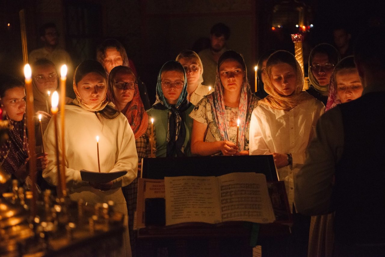Девушки репетируют песнопения к предстоящей литургии. Все девушки в лагере носят юбки или платьяФото: Сергей Пронин Сегодня студенты Свято-Тихоновского гуманитарного университета — это в основном дети из воцерковленных семей. «Поповичей» — детей из семей священников — всего десятая часть. Но есть и те, кто в старших классах увлекся литературой или философией и понял, что хочет больше узнать о мире христианства. Вообще, частая причина поступления на факультет — это желание углубиться в вероучение. Верующий человек нуждается в осмысленности. Среди студентов есть и те, кто собирается становиться священником. Вместе с основным курсом они получают специальное образование в отдельной структуре, занимающейся подготовкой будущих пастырей.