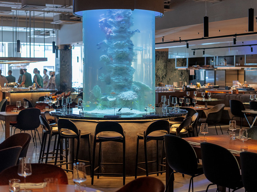 В рыбном ресторане от шефа Антонио Фреза установили аквариум в виде колонны, а рядом с ним открыли магазин морепродуктов.