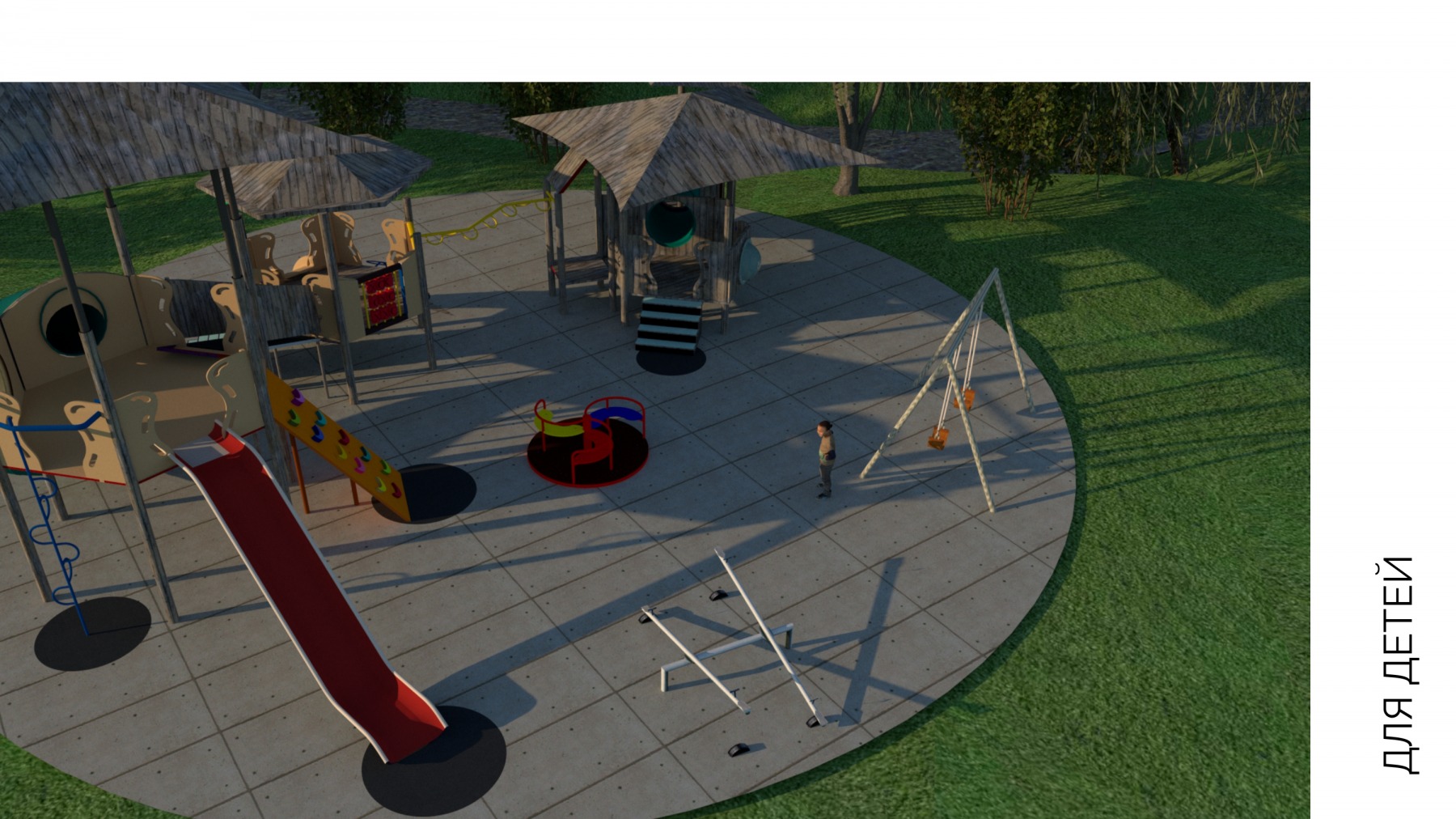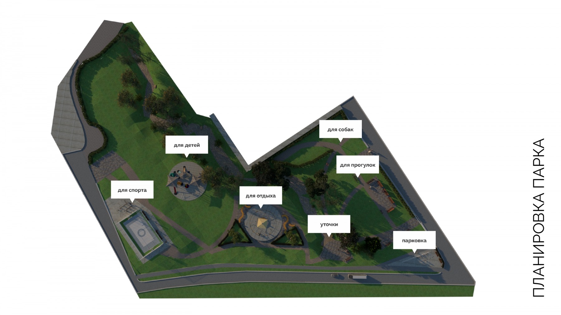 В самом центре парка предполагается подготовить локацию для молодёжи с качелями и круговой скамейкой под навесом. На детской площадке будет установлен игровой комплекс с качелями, горками и лестницами.