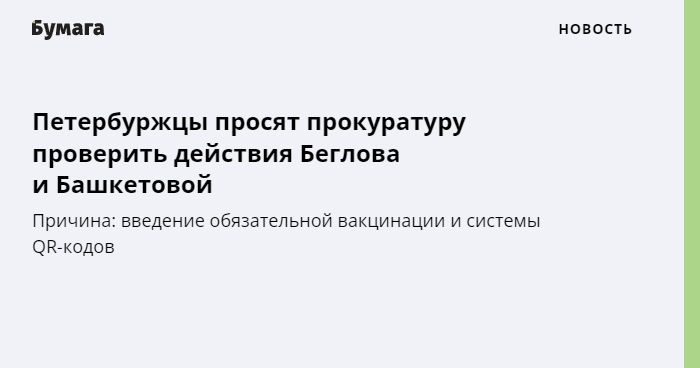 Петербуржцы просят прокуратуру проверить действия губернатора Александра Беглова и главного санитарного врача города Наталии Башкетовой. Активисты собрали под заявлениями около 10 тысяч подписей — документы оказались в распоряжении «РБК Петербург».